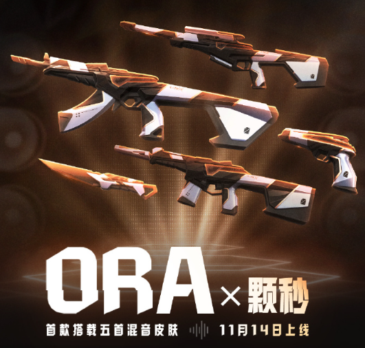 音浪超载,节拍不停歇收集『ORA x 颗秒』套装军刀、狂徒、幻影、冥驹、正义、卡面、喷漆、挂饰和『喇叭』盘盘,自带5首经典曲目,让战场变成你的音乐秀场!『ORA x 颗秒』套装,11月14日,你的战斗旋律你做主!ORA by OneTap(ORA × 颗秒)是 OneTap(简中译为“颗秒”)团队打造的首款武器皮肤。OneTap(颗秒)是《无畏契约》世界中的跨界艺术家集体,以融合精密工艺、街头潮流与运动文化的创作理念,带来前所未有的作战装备体验。